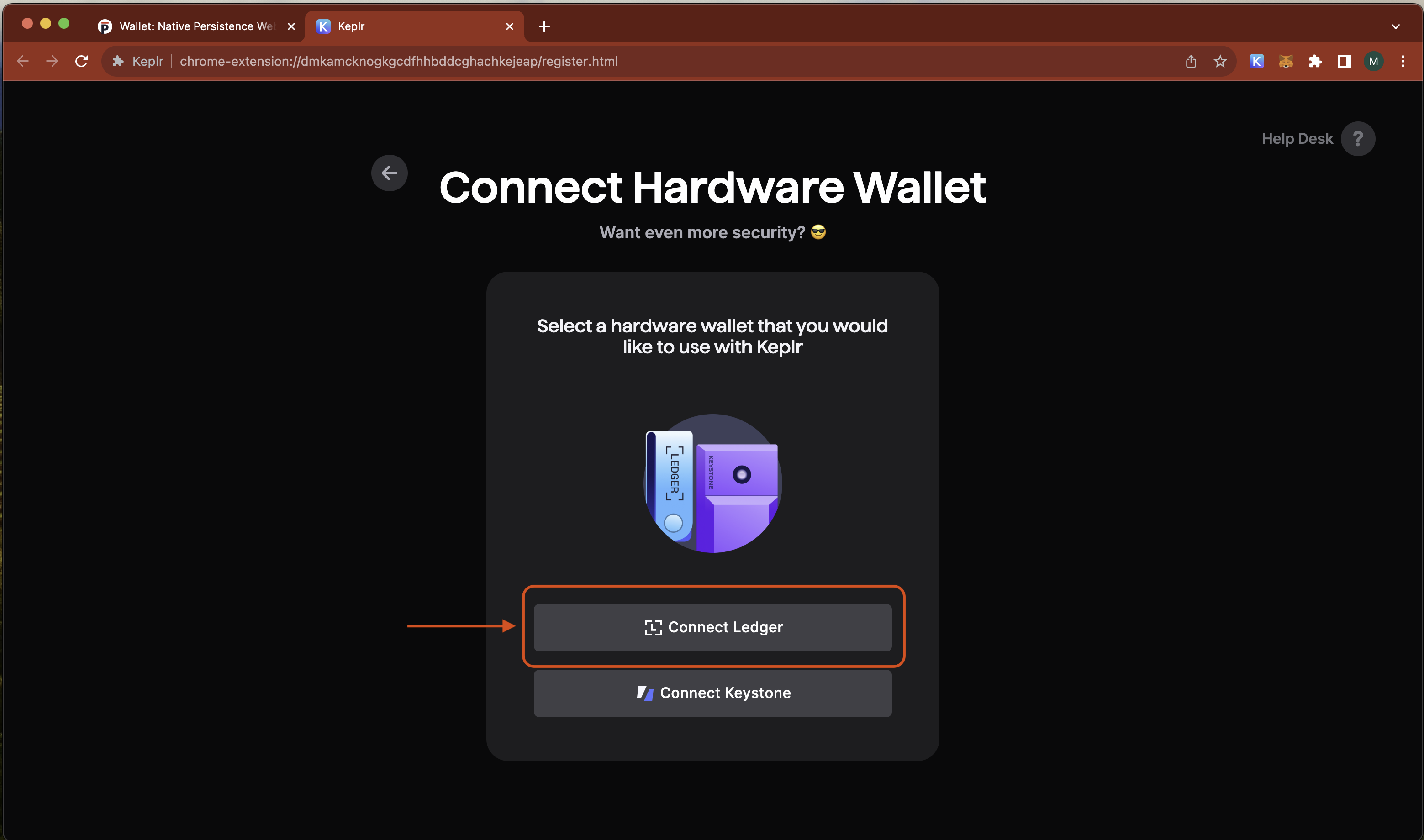 In this step we will import your ledger into keplr so that you can access your 118 coin-type wallet address.
